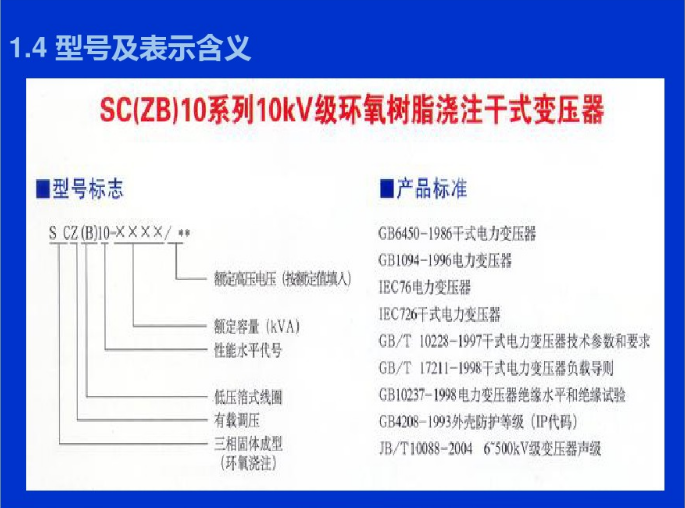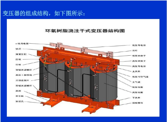 ⒊澆注式:用環氧樹脂或其它樹脂澆注作為主絕緣,它結構簡單、體積小,適用于較小容量的變壓器。